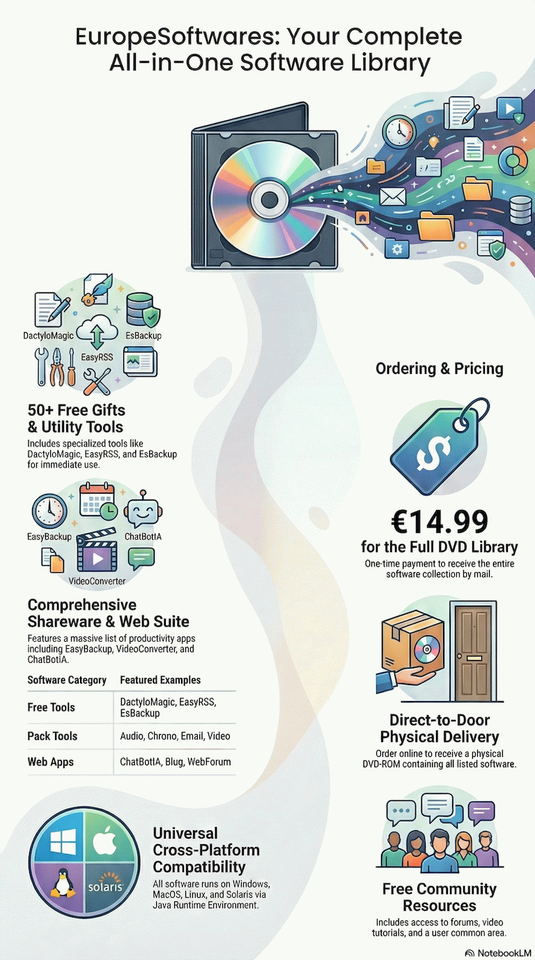 Our innovative solution allows you to integrate your software directly on the DVD-ROM with EuropeSoftwares software. Whether you're a company looking to offer combined solutions or a developer looking to make it easier to distribute your software, our DVD-ROM provides you with an ideal platform.