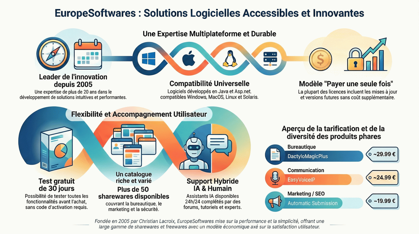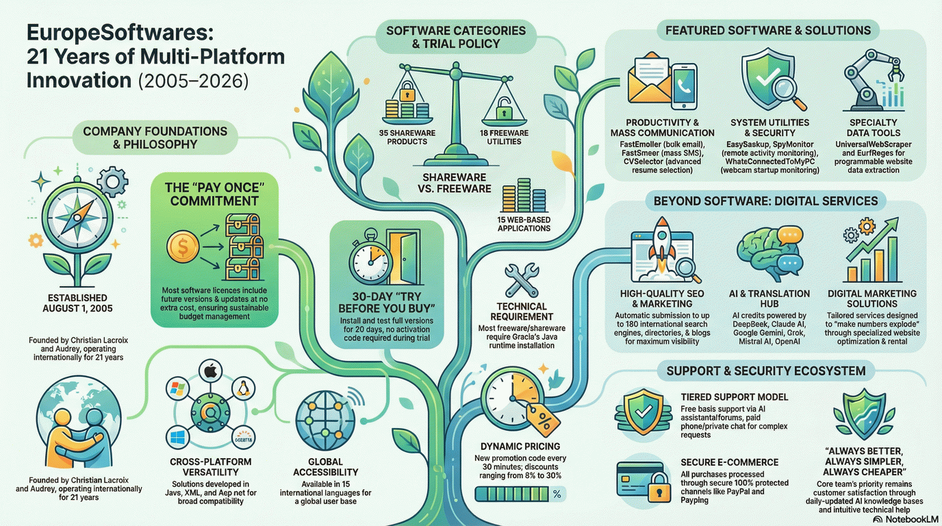 Ιδρύθηκε την 1η Αυγούστου 2005 από τον Christian Lacroix, με τη βοήθεια της Audrey, η EuropeSoftwares έχει καθιερωθεί ως ηγέτης στη δημιουργία του καλύτερου λογισμικού για Windows, Mac, Solaris & Solaris. Χάρη σε μια αφοσιωμένη και καινοτόμο ομάδα, προσφέρουμε λύσεις υψηλής απόδοσης και διαισθητικές λύσεις που ανταποκρίνονται στις ποικίλες ανάγκες των πελατών μας. Η δέσμευσή μας για την αριστεία μας επιτρέπει να σχεδιάζουμε προϊόντα που όχι μόνο πληρούν τα βιομηχανικά πρότυπα, αλλά και ξεπερνούν τα όρια της τεχνολογικής καινοτομίας. Στην EuropeSoftwares, πιστεύουμε ακράδαντα ότι η τεχνολογία πρέπει να απλοποιεί την καθημερινή και επαγγελματική ζωή, γι' αυτό και κάθε έργο πραγματοποιείται με πάθος και τεχνογνωσία για να διασφαλιστεί η απόλυτη ικανοποίηση των χρηστών μας.