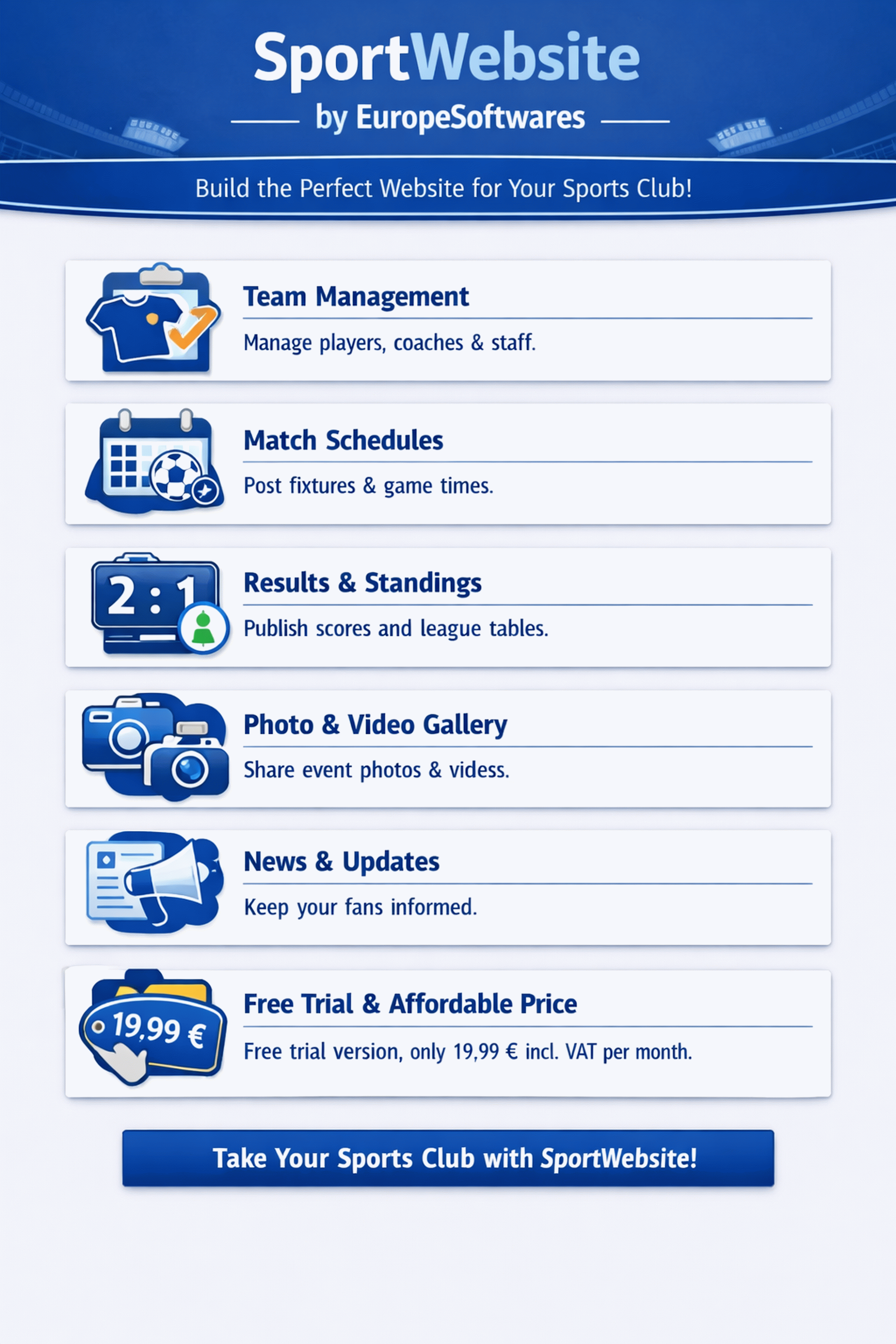 EuropeSoftwares에서 개발한 SportWebsite 소프트웨어는 스포츠 클럽을 위한 웹사이트입니다.