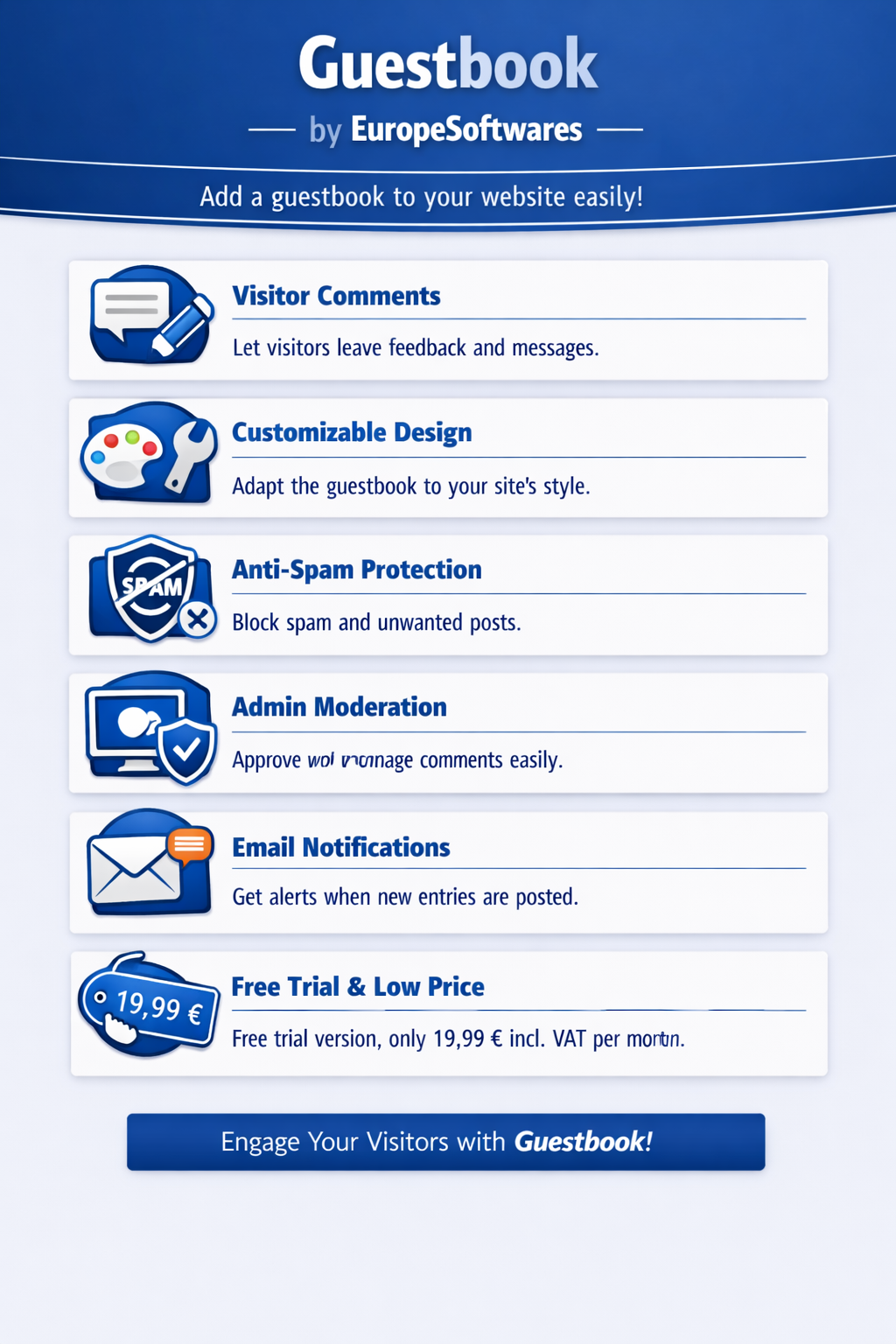| | Το λογισμικό Guestbook, που αναπτύχθηκε από την EuropeSoftwares, είναι ένας ιστότοπος βιβλίου επισκεπτών. | | Το βιβλίο επισκεπτών είναι ένα μέσο που χρησιμοποιείται για τη συλλογή μαρτυριών και συγχαρητηρίων από άτομα που είχαν μια συγκεκριμένη εμπειρία, είτε σε παραδοσιακή είτε σε ψηφιακή μορφή. Επιτρέπει στους πελάτες, σε μέρη όπως ένα δημαρχείο ή ένα εστιατόριο, να αφήσουν τις εντυπώσεις τους, εμπλουτίζοντας έτσι τη φήμη του καταλύματος. Σε εκδηλώσεις όπως ένας γάμος, γίνεται ένα ανεκτίμητο αναμνηστικό με τους όρκους των καλεσμένων, χρησιμεύοντας ως εργαλείο για την ενίσχυση της σύνδεσης με τους επισκέπτες και την απαθανάτιση των εμπειριών τους. | | Αυτός ο χώρος στοχεύει να επιτρέψει στους επισκέπτες να εκφράσουν την ευγνωμοσύνη και την υποστήριξή τους, ενισχύοντας τη σύνδεσή τους με την κοινότητα. Οι θετικές αλληλεπιδράσεις που ενθαρρύνονται ενισχύουν την αίσθηση του ανήκειν και την αμοιβαία αναγνώριση. Με την προώθηση της δέσμευσης και την εκτίμηση των συνδέσεων, αυτό το περιβάλλον καλωσορίζει την ευγνωμοσύνη και την υποστήριξη ως βασικούς μοχλούς της κοινότητας. | | Πολλές πόλεις προσκαλούν προσωπικότητες σε επίσημες επισκέψεις να υπογράψουν το βιβλίο επισκεπτών τους, μια συμβολική χειρονομία της επίσκεψής τους. Αυτή η παράδοση μεταφέρεται πλέον στο Διαδίκτυο, όπου οι ιδιοκτήτες προσωπικών σελίδων χρησιμοποιούν ψηφιακά βιβλία επισκεπτών για να συλλέξουν απόψεις και εντυπώσεις από τους επισκέπτες. Αυτό το διαδραστικό και σύγχρονο εργαλείο συμβάλλει στην οικοδόμηση της αφοσίωσης του κοινού, στη βελτίωση της διαδικτυακής προβολής και στη συμμετοχή της κοινότητας, ενώ παράλληλα χτίζει αξιοπιστία και προσελκύει ένα ευρύτερο κοινό. | | Το λογισμικό είναι διαθέσιμο σε 15 διεθνείς γλώσσες, καθιστώντας το προσβάσιμο σε ένα ευρύ φάσμα χρηστών σε όλο τον κόσμο. Προσφέρει μια διαισθητική διεπαφή προσαρμοσμένη στις συγκεκριμένες ανάγκες επικοινωνίας και επιτρέπει τη μη αυτόματη προσθήκη άλλων γλωσσών για μεγαλύτερη ευελιξία. Αυτή η πολύγλωσση δυνατότητα το καθιστά απαραίτητο εργαλείο για επιχειρήσεις που θέλουν να επεκτείνουν τη συνολική τους εμβέλεια και να βελτιώσουν την αφοσίωση των χρηστών. | | Οι νέες εξελίξεις λογισμικού για την ίδια έκδοση περιλαμβάνονται χωρίς επιπλέον κόστος, διασφαλίζοντας τις πιο πρόσφατες βελτιώσεις. Προτεραιότητά μας είναι να διατηρήσουμε τις τιμές χαμηλές για καλή σχέση ποιότητας-τιμής. Μπορεί να χρεωθεί μόνο υποστήριξη που απαιτεί ακριβό εργατικό δυναμικό, ανάλογα με την πολυπλοκότητα του αιτήματος, διασφαλίζοντας παράλληλα ποιοτική υπηρεσία. | | Οι ιστοσελίδες μπορούν να προσαρμοστούν ευέλικτα, επιτρέποντας την αλλαγή στοιχείων όπως τίτλοι, χρώματα και κείμενα για μια μοναδική εμπειρία χρήστη. Η διαχείριση περιεχομένου δεν απαιτεί γνώσεις υπολογιστή, καθιστώντας τη διαχείριση προσβάσιμη σε αρχάριους. Αυτή η φιλική προς το χρήστη προσέγγιση απλοποιεί την επεξεργασία και τη βελτιστοποίηση σελίδων, καθιστώντας τη διαχείριση του ιστότοπου ευκολότερη για όλους. | | Το EuropeSoftwares προσφέρει απεριόριστα δωρεάν εργαλεία για τη βελτιστοποίηση της παραγωγικότητας και της αποδοτικότητας των χρηστών του. Αυτές οι λύσεις υψηλής ποιότητας στοχεύουν στην απλοποίηση των διαδικασιών σε διάφορους τομείς όπως η διαχείριση έργων ή η ανάπτυξη λογισμικού. Εκμεταλλευτείτε αυτή την ευκαιρία για να βελτιώσετε τ