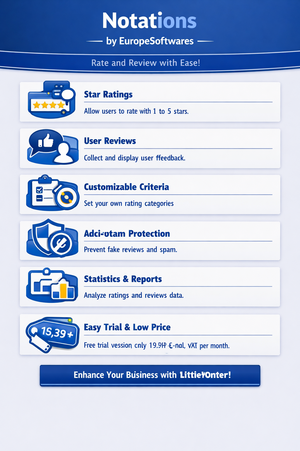 | | The Notations software, developed by EuropeSoftwares, is a website for comments and ratings | | A review and rating website allows users to share their opinions and rate various products or services, influencing the purchasing decisions of potential consumers. These platforms offer a valuable database of feedback that contributes to transparency and market quality. Businesses can use this feedback to improve their offerings and boost their online reputation. | | Websites are divided into generalist, specialized, and enterprise platforms, each with specific features to meet different needs. Generalist sites offer a wide range of information for a varied audience, while specialized sites focus on specific areas, attracting an audience in search of expertise. Enterprise platforms meet the internal or external needs of companies, integrating features such as content management and e-commerce to facilitate business operations. | | Customer reviews are essential for providing information about the quality and reliability of products or services, helping to build trust. For consumers, these reviews are a valuable resource for making informed purchases by comparing the experiences of other users. Businesses, by effectively managing these reviews, can improve their offerings, strengthen their online reputation, retain their customers, and attract new ones, making reviews a key strategic lever. | | The software is available in 15 international languages, making it accessible to a wide range of users around the world. It offers an intuitive interface tailored to specific communication needs, and allows for the manual addition of other languages for greater flexibility. This multilingual feature makes it an essential tool for businesses looking to expand their overall reach and improve user engagement. | | New software developments for the same version are included at no additional cost, ensuring the latest improvements. Our priority is to keep prices low for good value for money. Only support that requires expensive labor can be charged, depending on the complexity of the request, while ensuring a quality service. | | Web pages can be flexibly customized, allowing elements such as titles, colors, and texts to be changed for a unique user experience. Content management does not require any computer knowledge, making administration accessible to beginners. This user-friendly approach simplifies page editing and optimization, making site management easier for everyone. | | EuropeSoftwares offers unlimited free tools to optimize the productivity and efficiency of its users. These high-quality solutions are aimed at simplifying processes in various areas such as project management or software development. Take advantage of this opportunity to improve your technical skills and the quality of your projects without restrictions. | | To use the software, compatible web hosting is required. It is important to check that the hosting supports the versions and technologies of the desired application. This verification ensures the proper functioning and effectiveness of the application. | | | | EuropeSoftwares strives to improve the accessibility of its products by focusing on the simplicity and efficiency of their design. Their goal is to ensure that their software is quickly and intuitively used for all users, regardless of their technical level. By adopting a user-centric approach, they aim to democratize access to digital tools to make their products easily manageable by all. |