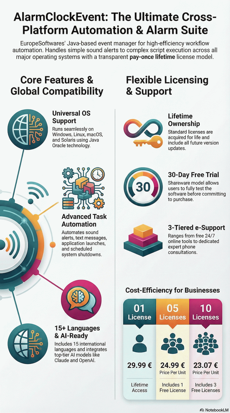 | | The AlarmClockEvent software, developed by EuropeSoftwares, is an alarm and event manager. | | An icon is placed on the taskbar for easy access to an application or shortcut. This improves the user experience by making it easier to navigate the operating system's functions. In summary, this icon optimizes the workflow on the desktop. | | The app offers a variety of automated events, including sound alerts and text messages to notify users. It can also open other applications automatically and run custom scripts to automate complex tasks. A useful feature includes programmed computer shutdown to save power or increase safety. | | The software is available in 15 international languages, making it accessible to a wide range of users around the world. It offers an intuitive interface tailored to specific communication needs, and allows for the manual addition of other languages for greater flexibility. This multilingual feature makes it an essential tool for businesses looking to expand their overall reach and improve user engagement. | | The software offer includes new versions and evolutions at no additional cost, always guaranteeing the latest improvements to customers. Only support services that require expensive labor can be charged, with these costs adjusted according to specific demand. This transparent and flexible approach aims to deliver optimal value and enable efficient budget management without surprises. | | EuropeSoftwares offers unlimited free tools to optimize the productivity and efficiency of its users. These high-quality solutions are aimed at simplifying processes in various areas such as project management or software development. Take advantage of this opportunity to improve your technical skills and the quality of your projects without restrictions. | | | | EuropeSoftwares strives to improve the accessibility of its products by focusing on the simplicity and efficiency of their design. Their goal is to ensure that their software is quickly and intuitively used for all users, regardless of their technical level. By adopting a user-centric approach, they aim to democratize access to digital tools to make their products easily manageable by all. |