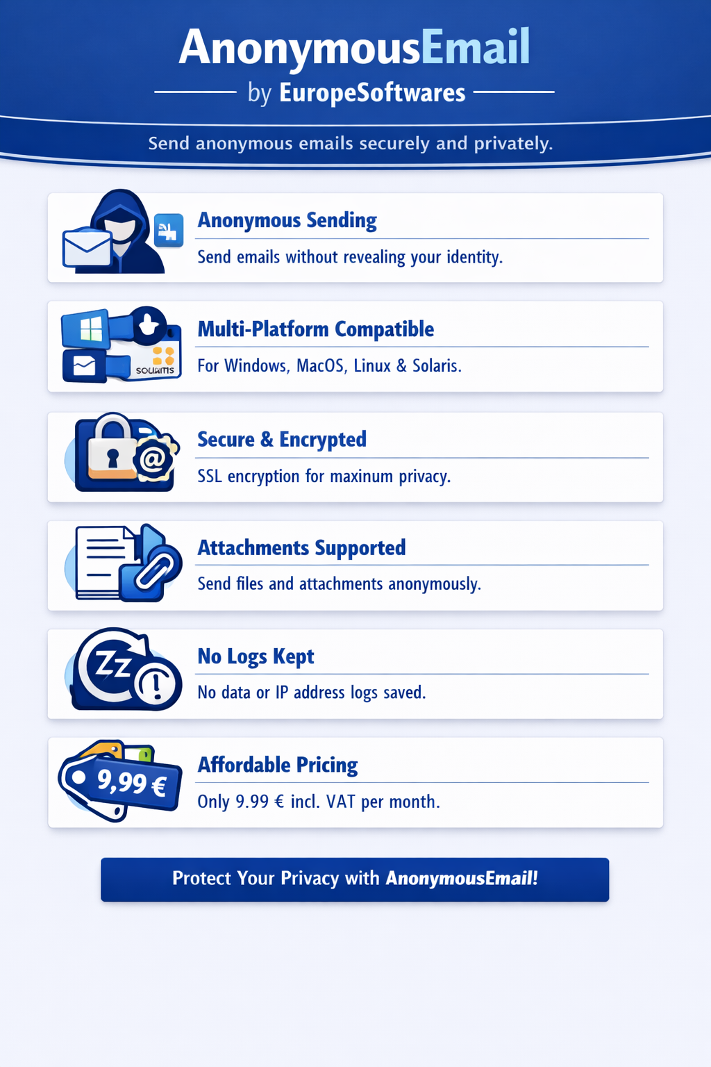 The AnonymousEmail software, developed by EuropeSoftwares, is an anonymous email client.