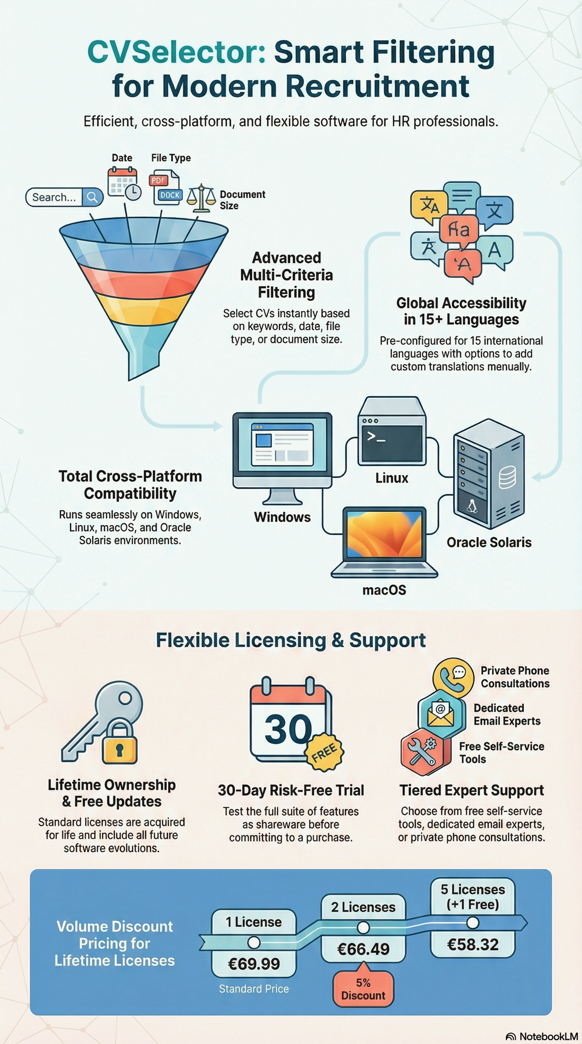 | | CVSelector software, developed by EuropeSoftwares, is a file selection utility. | | This powerful tool allows you to select files based on various criteria, such as date, type, or size. It offers increased flexibility and efficiency to manage your documents through an intuitive interface. Whether you're a professional or a casual user, this system optimizes file management. | | Keyword-based screening software allows you to efficiently sort resumes by analyzing each document according to specific search criteria. Only documents that meet these criteria precisely are selected, simplifying the process for users. This system saves recruiters a lot of time by making it easier to select targeted applications from a large number of people. | | The software is available in 15 international languages, making it accessible to a wide range of users around the world. It offers an intuitive interface tailored to specific communication needs, and allows for the manual addition of other languages for greater flexibility. This multilingual feature makes it an essential tool for businesses looking to expand their overall reach and improve user engagement. | | The software offer includes new versions and evolutions at no additional cost, always guaranteeing the latest improvements to customers. Only support services that require expensive labor can be charged, with these costs adjusted according to specific demand. This transparent and flexible approach aims to deliver optimal value and enable efficient budget management without surprises. | | EuropeSoftwares offers unlimited free tools to optimize the productivity and efficiency of its users. These high-quality solutions are aimed at simplifying processes in various areas such as project management or software development. Take advantage of this opportunity to improve your technical skills and the quality of your projects without restrictions. | | | | EuropeSoftwares strives to improve the accessibility of its products by focusing on the simplicity and efficiency of their design. Their goal is to ensure that their software is quickly and intuitively used for all users, regardless of their technical level. By adopting a user-centric approach, they aim to democratize access to digital tools to make their products easily manageable by all. |