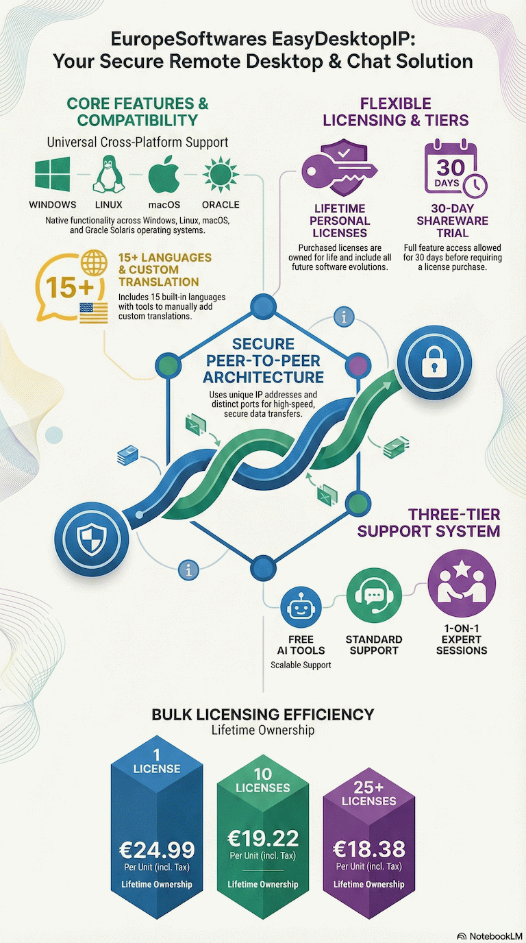 | | Questa soluzione software di comunicazione sviluppata da EuropeSoftwares permette di visualizzare il desktop e chattare online da PC a PC. | | Il sistema utilizza l'indirizzo IP unico dell'utente per facilitare un'interazione fluida tramite porte separate dedicate alla chat online e alle interazioni sul desktop. Questa configurazione garantisce un trasferimento dei dati sicuro e veloce, migliorando l'esperienza utente. Ottimizzare le interfacce in entrata e in uscita consente una sincronizzazione perfetta, riducendo la latenza e aumentando la reattività del sistema per un coinvolgimento di alta qualità degli utenti. | | Il software è disponibile in 15 lingue internazionali, rendendolo accessibile a un'ampia gamma di utenti in tutto il mondo. Offre un'interfaccia intuitiva su misura per esigenze specifiche di comunicazione e consente l'aggiunta manuale di altre lingue per una maggiore flessibilità. Questa funzione multilingue la rende uno strumento essenziale per le aziende che desiderano ampliare la propria portata complessiva e migliorare il coinvolgimento degli utenti. | | L'offerta software include nuove versioni ed evoluzioni senza costi aggiuntivi, garantendo sempre i migliori aggiornamenti ai clienti. Possono essere addebitati solo i servizi di supporto che richiedono manodopera costosa, con questi costi adattati alla domanda specifica. Questo approccio trasparente e flessibile mira a offrire il valore ottimale e a consentire una gestione efficiente del budget senza sorprese. | | EuropeSoftwares offre strumenti gratuiti illimitati per ottimizzare la produttività e l'efficienza dei suoi utenti. Queste soluzioni di alta qualità mirano a semplificare i processi in vari ambiti come la gestione di progetti o lo sviluppo software. Approfitta di questa opportunità per migliorare le tue competenze tecniche e la qualità dei tuoi progetti senza restrizioni. | | | | EuropeSoftware si impegna a migliorare l'accessibilità dei suoi prodotti concentrandosi sulla semplicità ed efficienza del loro design. Il loro obiettivo è garantire che il loro software venga utilizzato in modo rapido e intuitivo per tutti gli utenti, indipendentemente dal loro livello tecnico. Adottando un approccio centrato sull'utente, mirano a democratizzare l'accesso agli strumenti digitali per rendere i loro prodotti facilmente gestibili da tutti. |