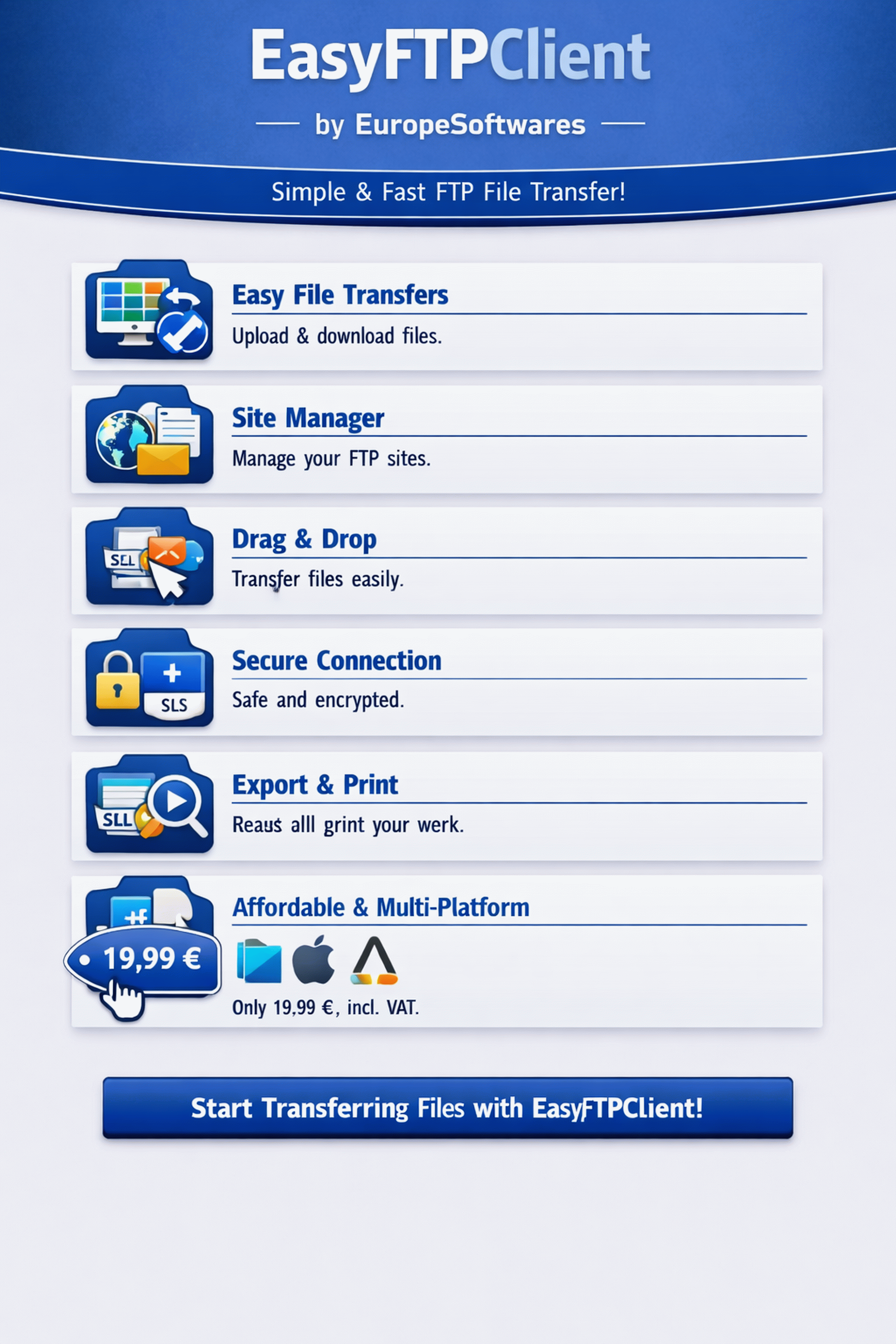 | | The EasyFTPClient software, developed by EuropeSoftwares, is an FTP client. | | The EasyFTP software offers two versions: EasyFTPClient, ideal for individuals and small businesses thanks to its simplicity, and EasyFTPMultiClient, intended for more demanding users and large companies, allowing the simultaneous management of several FTP sessions. Both versions support FTP, SFTP and FTPS protocols, ensuring security and data compatibility. EasyFTP offers a robust solution to optimize file management while securing data exchanges. | | This innovative tool simplifies file transfer over the Internet in just a few clicks with an intuitive interface that is accessible even to beginners. It provides enhanced security and speed to ensure files reach their destination without delay. With this cutting-edge technology, the online file sharing experience is optimized. | | This powerful tool ensures efficient and secure file transfers to FTP servers, regardless of the hosting environment. It is ideal for businesses and professionals looking for a robust solution, while offering extensive compatibility with various systems to optimize operations. Its proven reliability makes it a preferred choice for simplifying the transfer process while ensuring a high quality of service. | | The software is available in 15 international languages, making it accessible to a wide range of users around the world. It offers an intuitive interface tailored to specific communication needs, and allows for the manual addition of other languages for greater flexibility. This multilingual feature makes it an essential tool for businesses looking to expand their overall reach and improve user engagement. | | The software offer includes new versions and evolutions at no additional cost, always guaranteeing the latest improvements to customers. Only support services that require expensive labor can be charged, with these costs adjusted according to specific demand. This transparent and flexible approach aims to deliver optimal value and enable efficient budget management without surprises. | | EuropeSoftwares offers unlimited free tools to optimize the productivity and efficiency of its users. These high-quality solutions are aimed at simplifying processes in various areas such as project management or software development. Take advantage of this opportunity to improve your technical skills and the quality of your projects without restrictions. | | | | EuropeSoftwares strives to improve the accessibility of its products by focusing on the simplicity and efficiency of their design. Their goal is to ensure that their software is quickly and intuitively used for all users, regardless of their technical level. By adopting a user-centric approach, they aim to democratize access to digital tools to make their products easily manageable by all. |