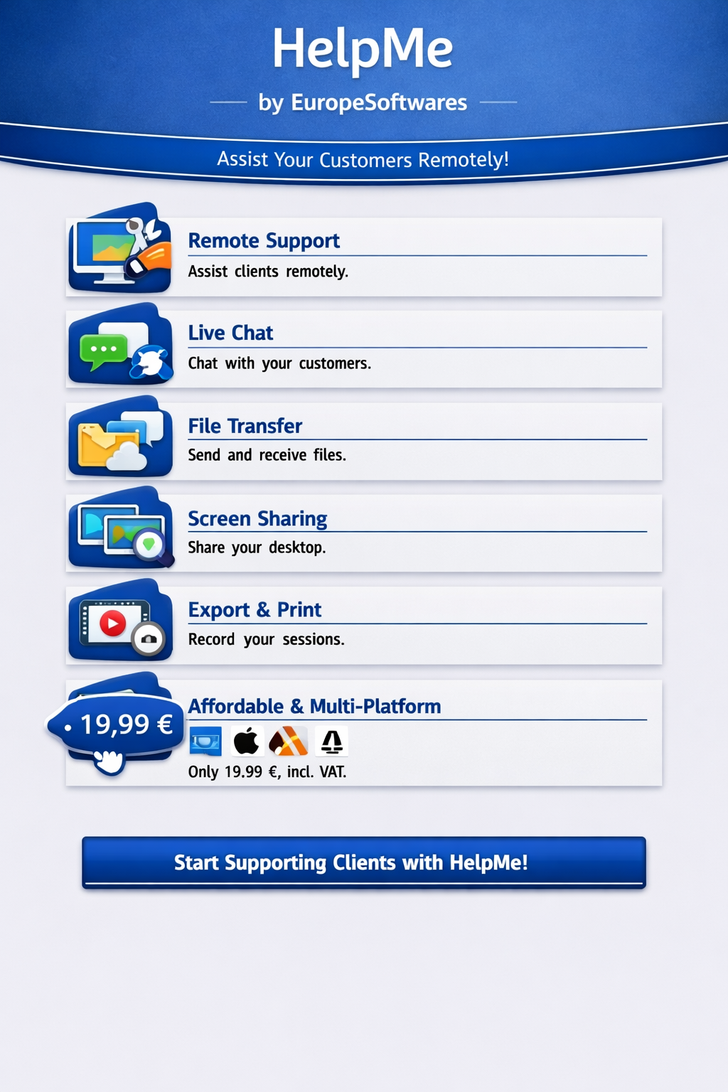 | | The HelpMe software, developed by EuropeSoftwares, is a computer-to-computer assistance utility. | | A new portable and ultra-lightweight software has been launched to improve communication between your device and your computer's software. Its use is simplified by entering the IP address and port of the remote computer, making the exchange of information more efficient and productive. This software stands out for its low use of system resources, ensuring smooth and secure connectivity for professionals and occasional users. | | The software transcribes mouse movements and buttons to a remote computer, facilitating smooth interaction at a distance. It also allows for remote text entry, making it valuable for collaborative work and remote maintenance. By combining these features, it optimizes the management and control of operations, improving productivity and communication between electronic devices. | | The software is available in 15 international languages, making it accessible to a wide range of users around the world. It offers an intuitive interface tailored to specific communication needs, and allows for the manual addition of other languages for greater flexibility. This multilingual feature makes it an essential tool for businesses looking to expand their overall reach and improve user engagement. | | The software offer includes new versions and evolutions at no additional cost, always guaranteeing the latest improvements to customers. Only support services that require expensive labor can be charged, with these costs adjusted according to specific demand. This transparent and flexible approach aims to deliver optimal value and enable efficient budget management without surprises. | | EuropeSoftwares offers unlimited free tools to optimize the productivity and efficiency of its users. These high-quality solutions are aimed at simplifying processes in various areas such as project management or software development. Take advantage of this opportunity to improve your technical skills and the quality of your projects without restrictions. | | | | EuropeSoftwares strives to improve the accessibility of its products by focusing on the simplicity and efficiency of their design. Their goal is to ensure that their software is quickly and intuitively used for all users, regardless of their technical level. By adopting a user-centric approach, they aim to democratize access to digital tools to make their products easily manageable by all. |