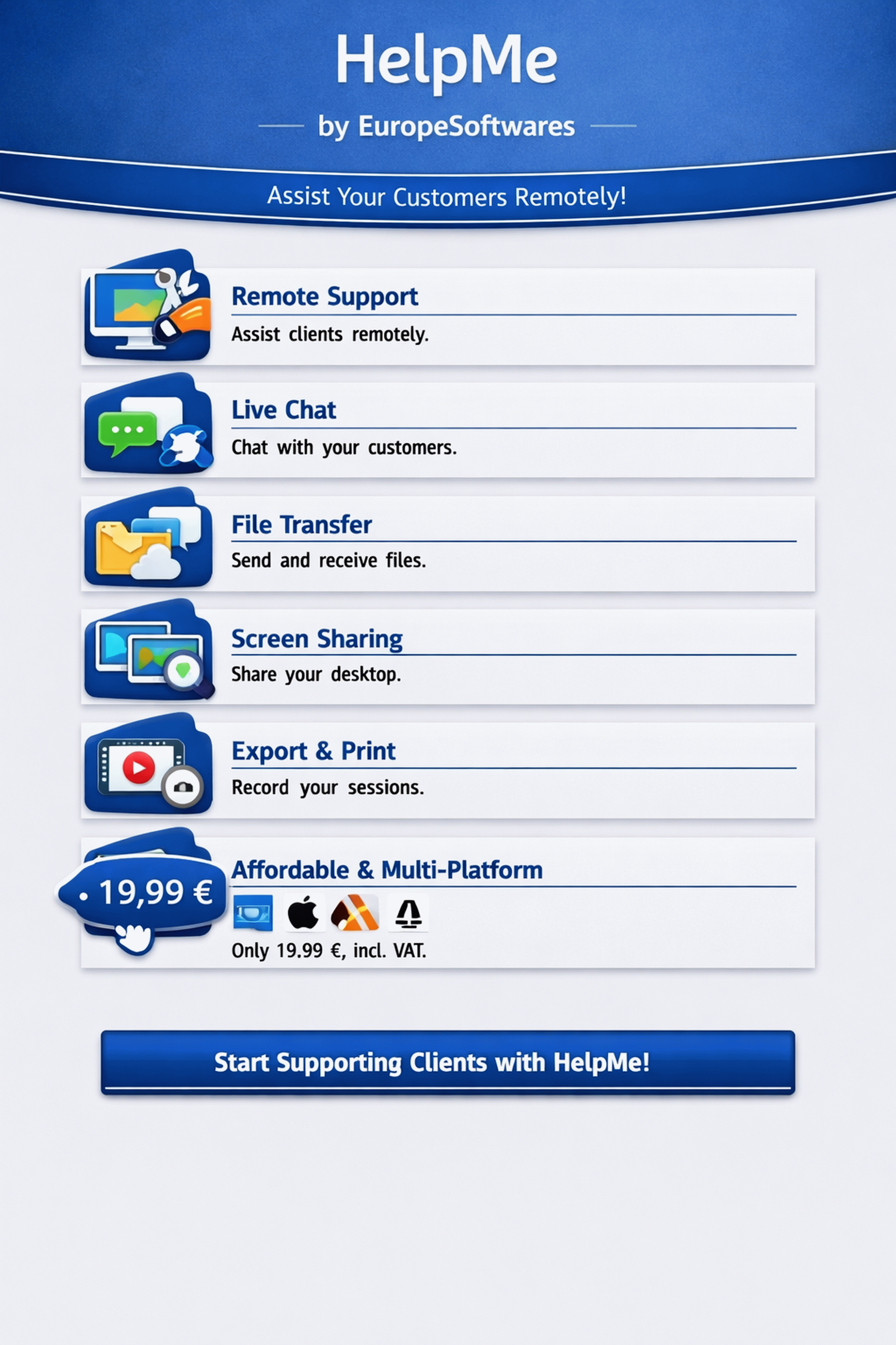 | | The HelpMe software, developed by EuropeSoftwares, is a computer-to-computer assistance utility. | | A new portable and ultra-lightweight software has been launched to improve communication between your device and your computer's software. Its use is simplified by entering the IP address and port of the remote computer, making the exchange of information more efficient and productive. This software stands out for its low use of system resources, ensuring smooth and secure connectivity for professionals and occasional users. | | The software transcribes mouse movements and buttons to a remote computer, facilitating smooth interaction at a distance. It also allows for remote text entry, making it valuable for collaborative work and remote maintenance. By combining these features, it optimizes the management and control of operations, improving productivity and communication between electronic devices. | | The software is available in 15 international languages, making it accessible to a wide range of users around the world. It offers an intuitive interface tailored to specific communication needs, and allows for the manual addition of other languages for greater flexibility. This multilingual feature makes it an essential tool for businesses looking to expand their overall reach and improve user engagement. | | The software offer includes new versions and evolutions at no additional cost, always guaranteeing the latest improvements to customers. Only support services that require expensive labor can be charged, with these costs adjusted according to specific demand. This transparent and flexible approach aims to deliver optimal value and enable efficient budget management without surprises. | | EuropeSoftwares offers unlimited free tools to optimize the productivity and efficiency of its users. These high-quality solutions are aimed at simplifying processes in various areas such as project management or software development. Take advantage of this opportunity to improve your technical skills and the quality of your projects without restrictions. | | | | EuropeSoftwares strives to improve the accessibility of its products by focusing on the simplicity and efficiency of their design. Their goal is to ensure that their software is quickly and intuitively used for all users, regardless of their technical level. By adopting a user-centric approach, they aim to democratize access to digital tools to make their products easily manageable by all. |