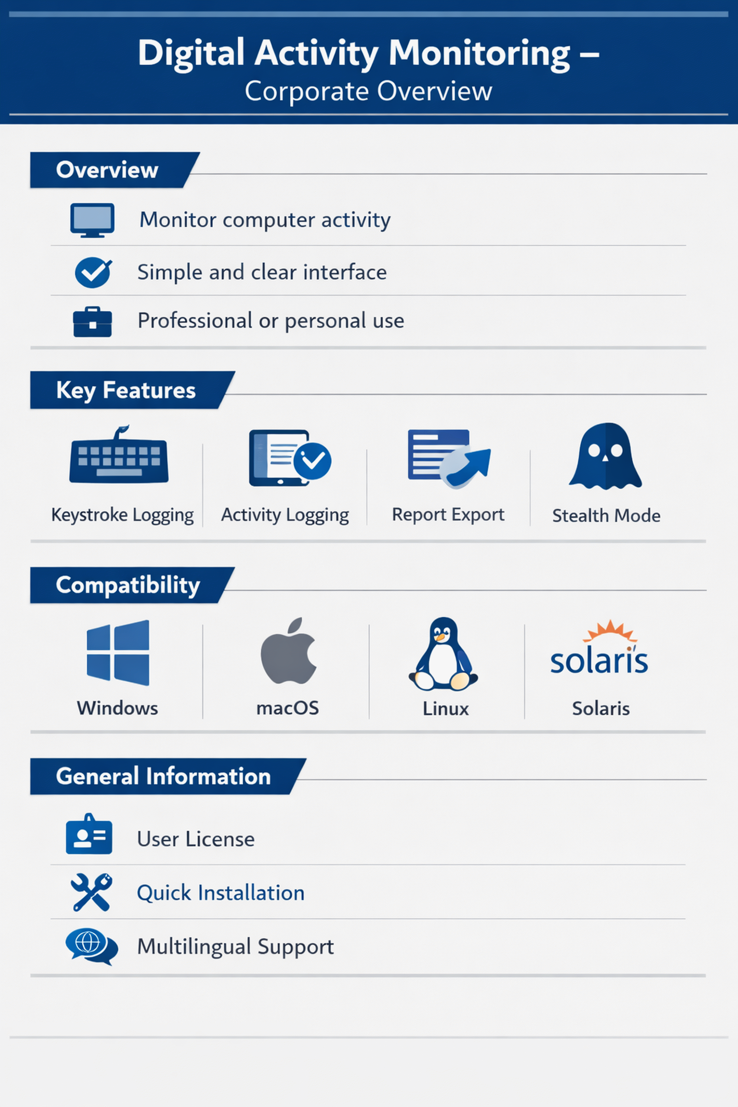 | | El software SpyMonitor, desarrollado por EuropeSoftwares, es una utilidad de espionaje informático. | | Este software de monitorización permite un análisis en profundidad de la actividad de un usuario en un ordenador remoto, asegurando la trazabilidad total de las acciones. Registra los periodos de uso para proporcionar datos detallados, lo que ayuda a las empresas a medir la productividad de sus empleados remotos y detectar anomalías. Además, esta herramienta ofrece soluciones de control parental para monitorizar los hábitos digitales de los niños y garantizar su seguridad en línea. | | Se envía por correo electrónico un informe de cada periodo de inicio de sesión y el historial se restablece mensualmente para ofrecer una visión general actualizada de la actividad en línea. Esta función permite una mejor gestión y análisis de las conexiones para aumentar la transparencia. Esto ayuda a los usuarios a mantenerse informados sobre sus actividades y facilita la gestión de los datos personales. | | El software está disponible en 15 idiomas internacionales, lo que lo hace accesible a una amplia variedad de usuarios en todo el mundo. Ofrece una interfaz intuitiva adaptada a necesidades específicas de comunicación y permite añadir manualmente otros idiomas para mayor flexibilidad. Esta función multilingüe la convierte en una herramienta esencial para las empresas que buscan ampliar su alcance general y mejorar la implicación de los usuarios. | | La oferta de software incluye nuevas versiones y evoluciones sin coste adicional, garantizando siempre las últimas mejoras a los clientes. Solo se pueden cobrar servicios de apoyo que requieran mano de obra costosa, ajustando estos costes según la demanda específica. Este enfoque transparente y flexible pretende ofrecer el valor óptimo y permitir una gestión eficiente del presupuesto sin sorpresas. | | EuropeSoftwares ofrece herramientas gratuitas ilimitadas para optimizar la productividad y eficiencia de sus usuarios. Estas soluciones de alta calidad están orientadas a simplificar procesos en diversas áreas como la gestión de proyectos o el desarrollo de software. Aprovecha esta oportunidad para mejorar tus habilidades técnicas y la calidad de tus proyectos sin restricciones. | | | | EuropeSoftwares se esfuerza por mejorar la accesibilidad de sus productos centrándose en la simplicidad y eficiencia de su diseño. Su objetivo es garantizar que su software se utilice de forma rápida e intuitiva para todos los usuarios, independientemente de su nivel técnico. Adoptando un enfoque centrado en el usuario, pretenden democratizar el acceso a las herramientas digitales para que sus productos sean fácilmente manejables para todos. |