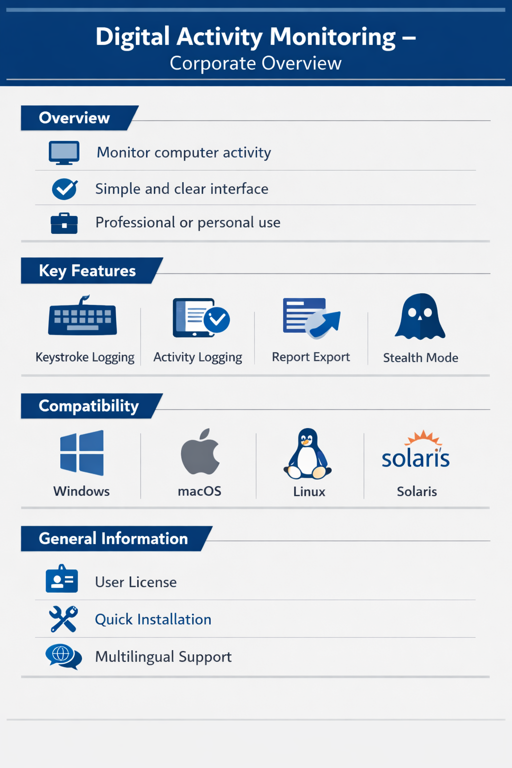| | SpyMonitor software, developed by EuropeSoftwares, is a computer spying utility. | | This monitoring software allows for in-depth analysis of a user's activity on a remote computer, ensuring full traceability of actions. It records usage periods to provide detailed data, which helps companies measure the productivity of their remote employees and detect anomalies. Also, this tool offers parental control solutions to monitor children's digital habits and ensure their online safety. | | A report of each login period is emailed, and the history is reset monthly for an up-to-date overview of online activity. This feature allows for better management and analysis of connections for increased transparency. This helps users stay informed about their activities while making it easier to manage personal data. | | The software is available in 15 international languages, making it accessible to a wide range of users around the world. It offers an intuitive interface tailored to specific communication needs, and allows for the manual addition of other languages for greater flexibility. This multilingual feature makes it an essential tool for businesses looking to expand their overall reach and improve user engagement. | | The software offer includes new versions and evolutions at no additional cost, always guaranteeing the latest improvements to customers. Only support services that require expensive labor can be charged, with these costs adjusted according to specific demand. This transparent and flexible approach aims to deliver optimal value and enable efficient budget management without surprises. | | EuropeSoftwares offers unlimited free tools to optimize the productivity and efficiency of its users. These high-quality solutions are aimed at simplifying processes in various areas such as project management or software development. Take advantage of this opportunity to improve your technical skills and the quality of your projects without restrictions. | | | | EuropeSoftwares strives to improve the accessibility of its products by focusing on the simplicity and efficiency of their design. Their goal is to ensure that their software is quickly and intuitively used for all users, regardless of their technical level. By adopting a user-centric approach, they aim to democratize access to digital tools to make their products easily manageable by all. |