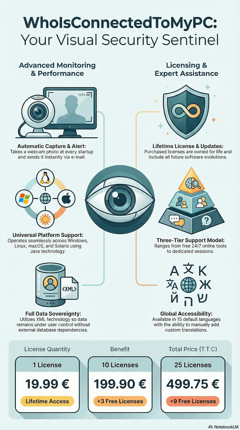 Each time the computer starts, an image capture is taken via the webcam and sent by e-mail, ensuring immediate follow-up of users. This feature improves device security and control by providing a visual trail of access. It aligns with modern security practices to strengthen the defense against unauthorized access.